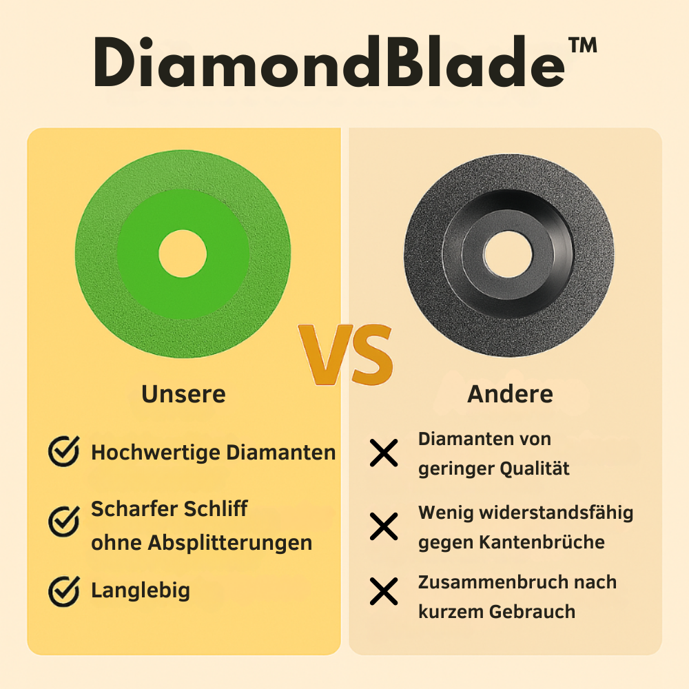 Sind Sie es leid, dass Schleifscheiben schnell brechen und stumpf werden? DiamondBlade liefert, was andere nur versprechen: sauberes Schneiden ohne Beschädigung und lange Haltbarkeit!