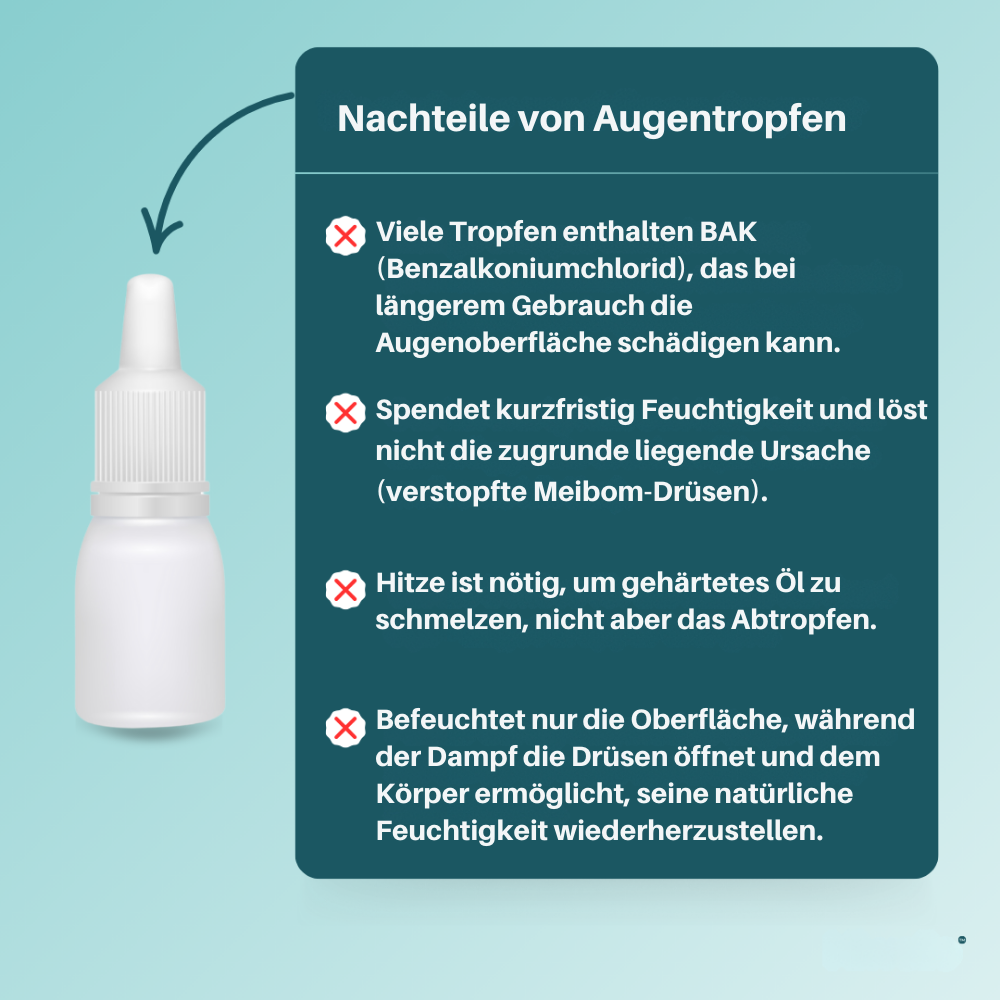 Der EyeSpa Steamer packt die Ursache Ihrer Beschwerden an der Wurzel - durch Erhitzen, Öffnen und Reinigen verstopfter Talgdrüsen. Er stellt das natürliche Feuchtigkeitssystem des Auges wieder her und lindert Reizungen - ohne Tabletten oder Tropfen.