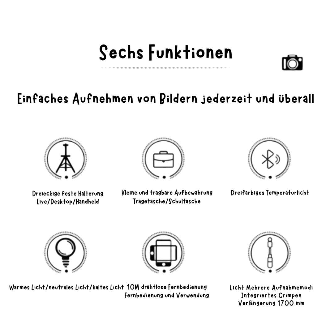 - Multifunktionalität - Das 6-in-1-Design bietet mehr als nur einen Selfie-Stick. Mache Weitwinkelaufnahmen, stabilisiere dein Telefon für Videos und finde die perfekte Beleuchtung mit den mitgelieferten Lichtern.