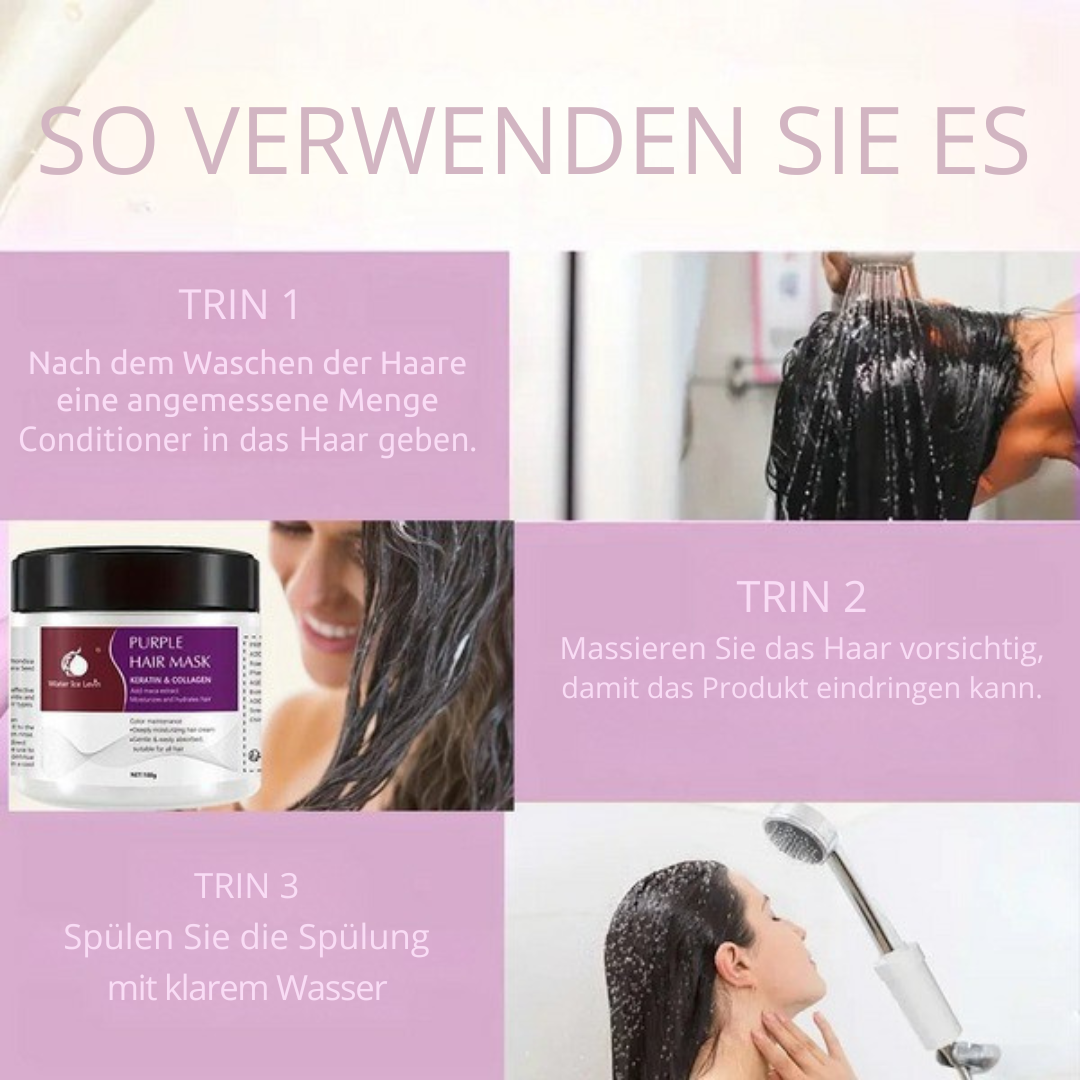- Trage die Purple Hair Mask großzügig in die Längen und Spitzen des Haares auf. Massiere sanft, um sicherzustellen, dass das Produkt gleichmäßig verteilt wird.