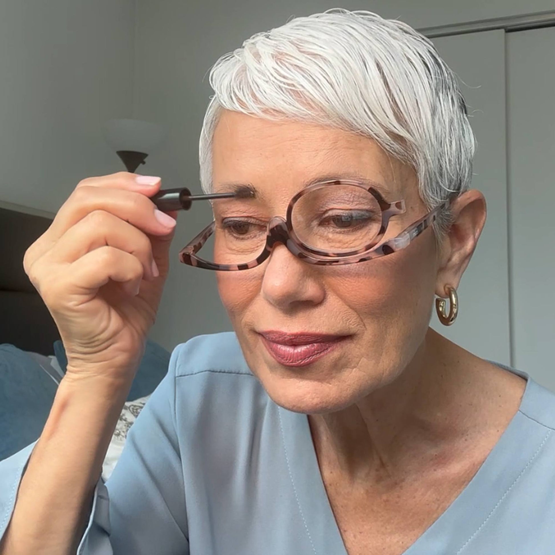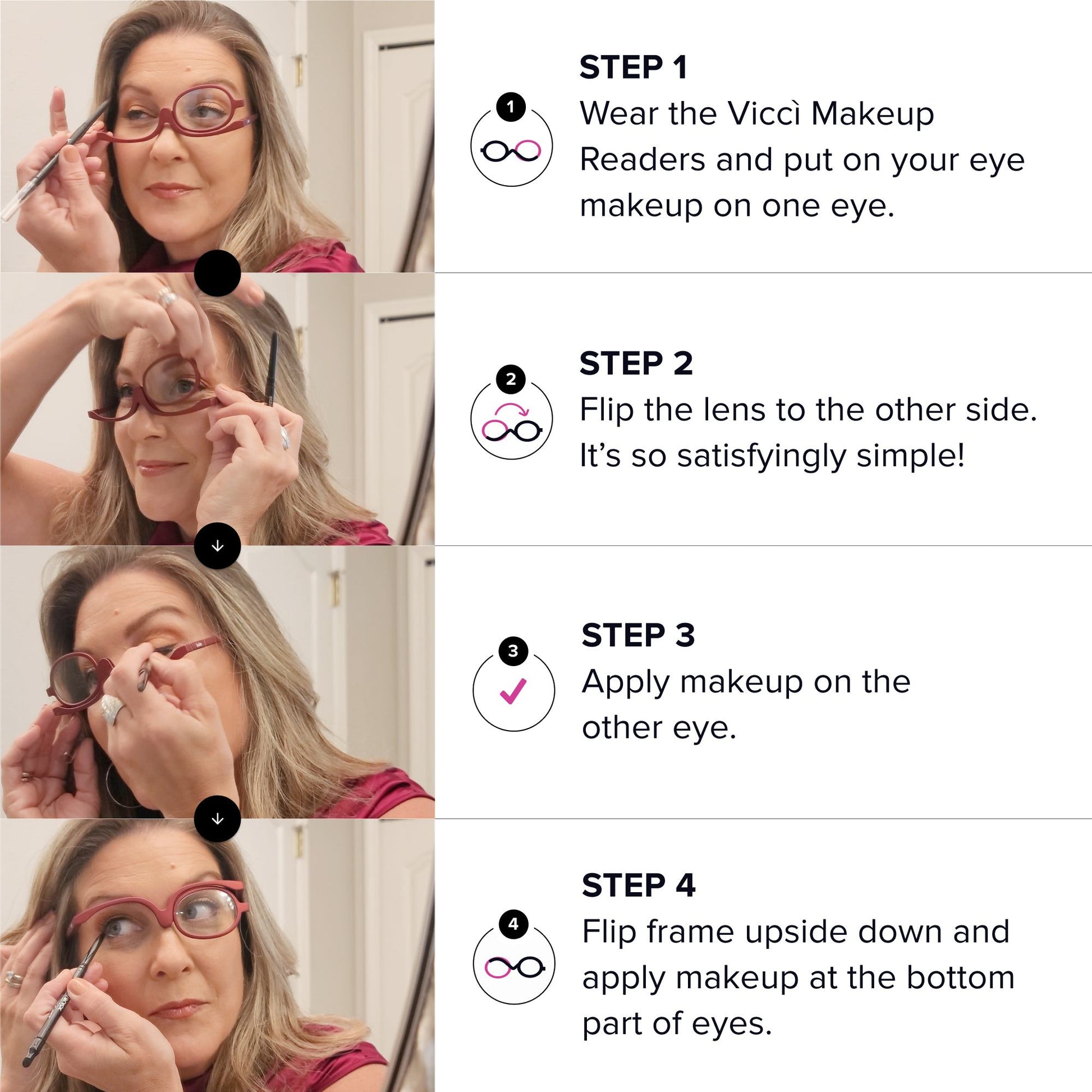 Brauchen Sie eine Brille, um klar zu sehen, aber haben Sie Schwierigkeiten, Augen-Make-up aufzutragen? Mit diesem cleveren Gerät können Sie beides tun! Halten Sie beide Hände frei und arbeiten Sie frei an jedem Auge, indem Sie die Linse auf das gegenüberliegende Auge drehen. So vermeiden Sie mühelos Flecken, Schlieren und ungleichmäßiges Make-up.