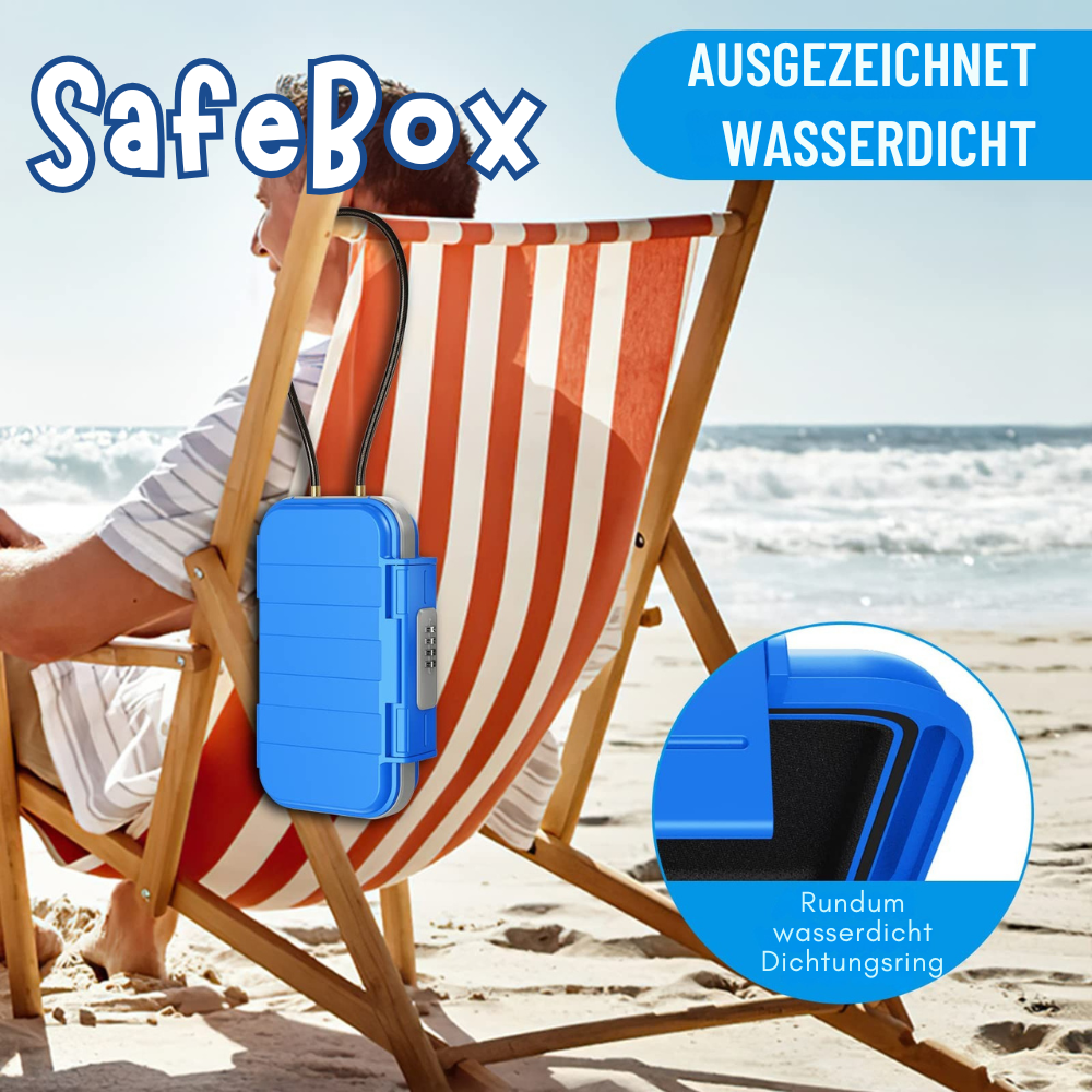 Ist SafeBox™ wasserdicht? Ja, das Gehäuse ist spritzwassergeschützt und schützt Ihre Gegenstände vor Feuchtigkeit, Sand und Regen.